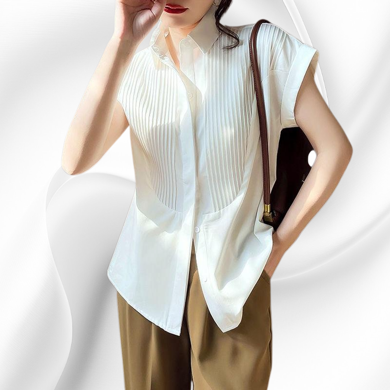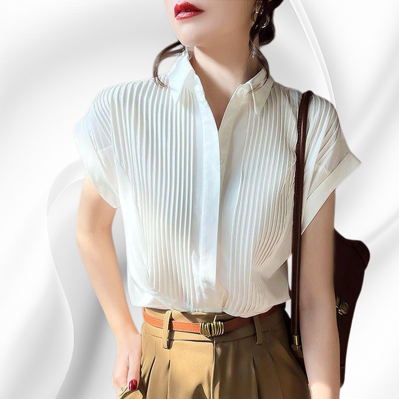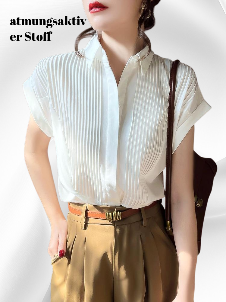 Leichtes Sommerhemd für Damen, weiß, atmungsaktives Material, modische kleine Falten, kurzärmlig, vielseitig kombinierbar, bequeme Passform für Alltag und Freizeit.